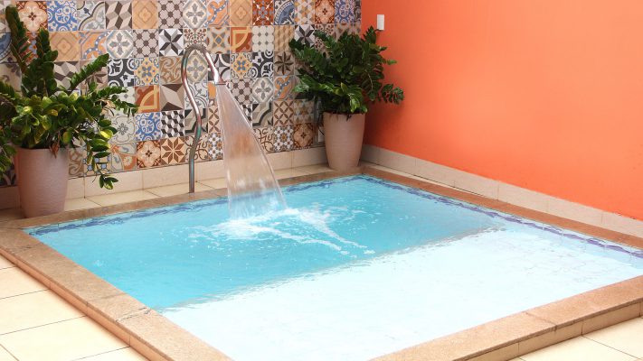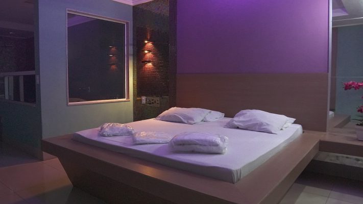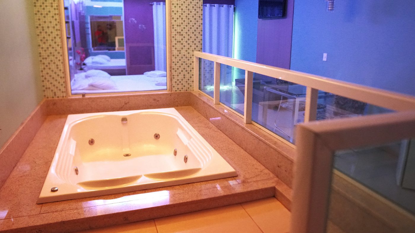 Nossas Suítes HIPER PLUS de alto padrão, possui uma piscina com cascata, sauna a vapor, frigobar, cine-privê, som, ar condicionado, banheira de hidromassagem e uma linda decoração.